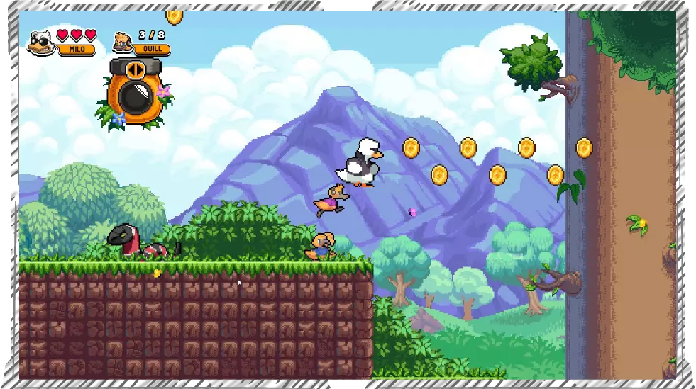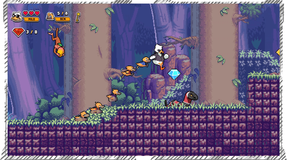 Aventure-se por um mundo em plataformas 2D side-scrolling. Explore e colete preciosidades ao longo do caminho, incluindo as mais secretas. Desfrute dos sons da natureza e da trilha sonora original, criada especialmente para cada ambiente, e personalize seus personagens com skins que podem ser adquiridas enquanto joga.